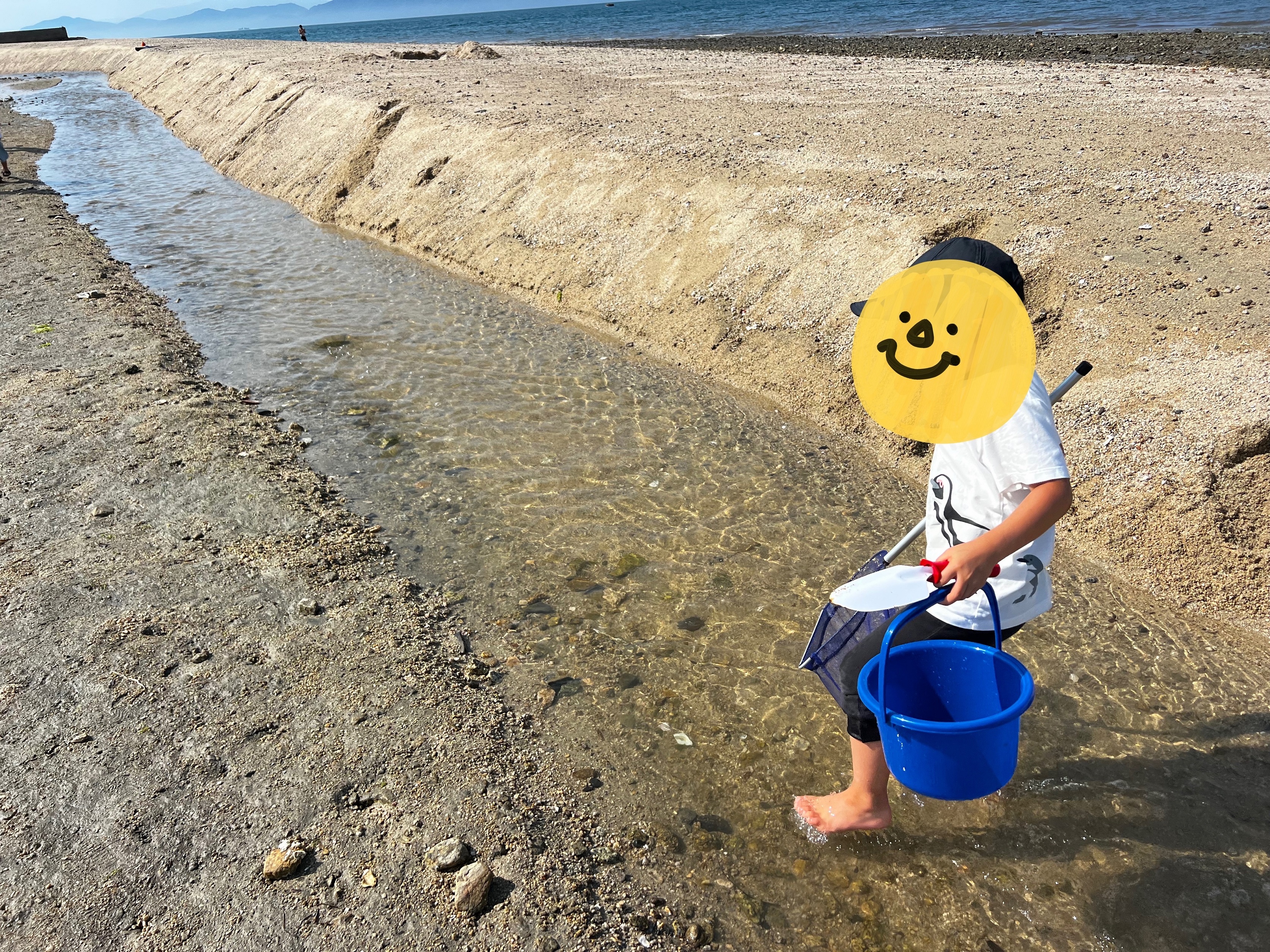 海の生き物を探す気満々で、網とバケツを持参している息子と、